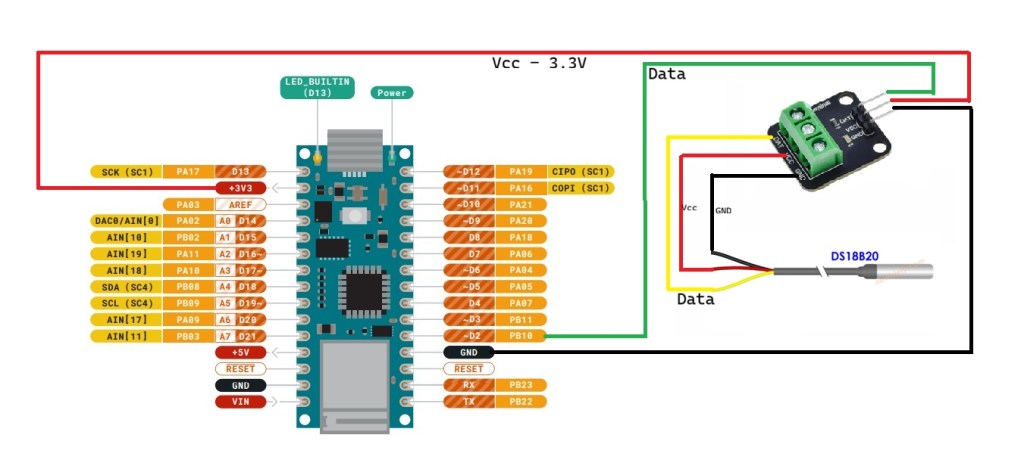 #define SENSOR_PIN 2 // The Arduino Nano 33 IoT pin D2 connected to DS18B20 sensor's DATA pin