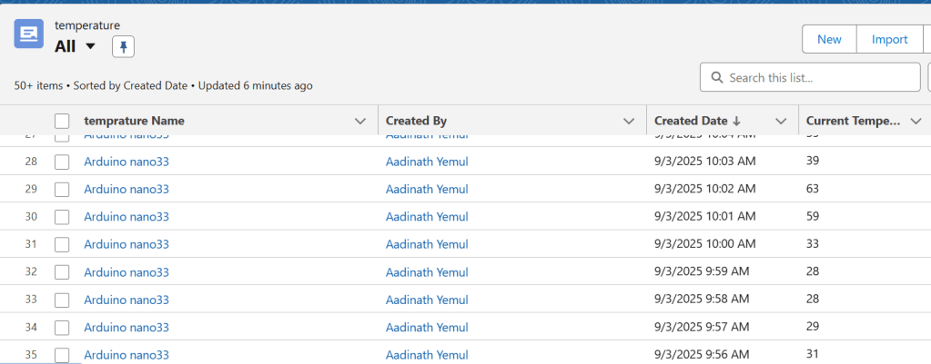 The primary objective of this project is to establish a seamless integration between an Arduino Nano 33 IoT microcontroller and Salesforce CRM. The Arduino device will capture real-time temperature data and transmit it securely to Salesforce using a Connected App. Temperature values will be stored in a custom Salesforce object (Temprature__c), updated automatically at one-minute intervals. Arduino makes a REST Call to Salesforce and sends back success or failure. On success the code would create a record in salesforce of the current temperature sensor in C.
